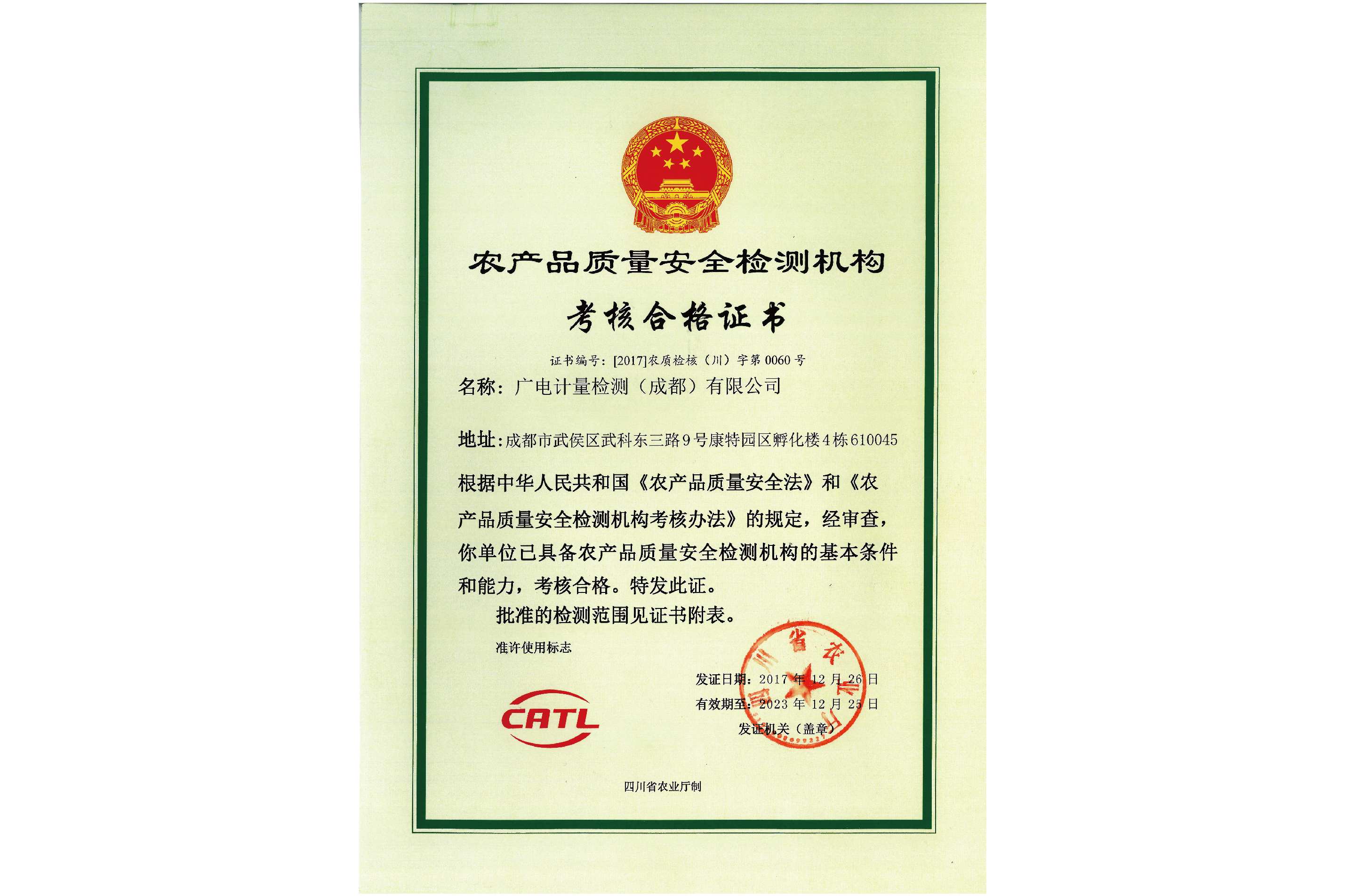 农产品质量安全检测机构(CATL)合格证书-开云检测(成都 )有限公司