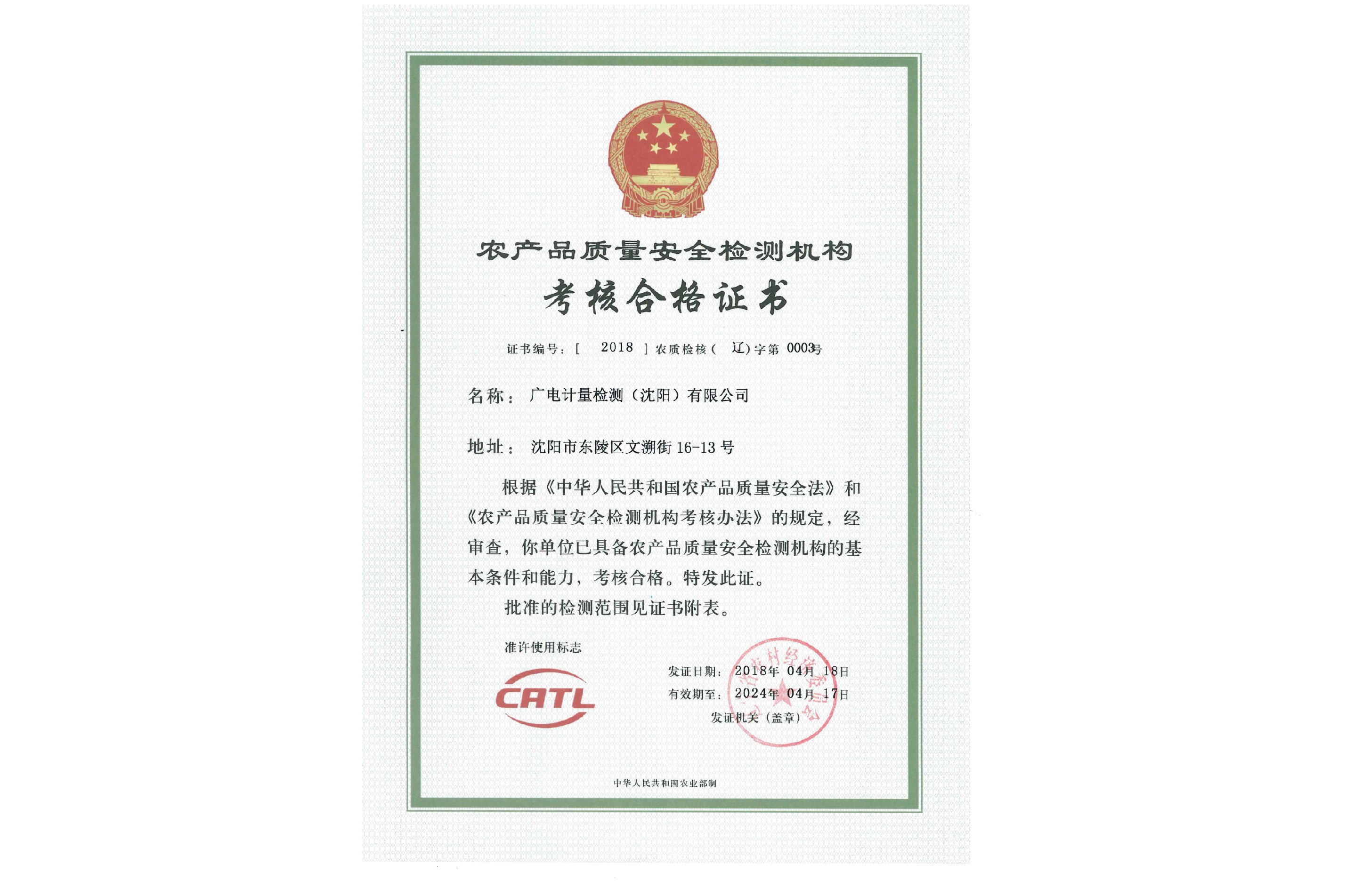 农产品质量安全检测机构(CATL)合格证书-开云(沈阳 )有限公司