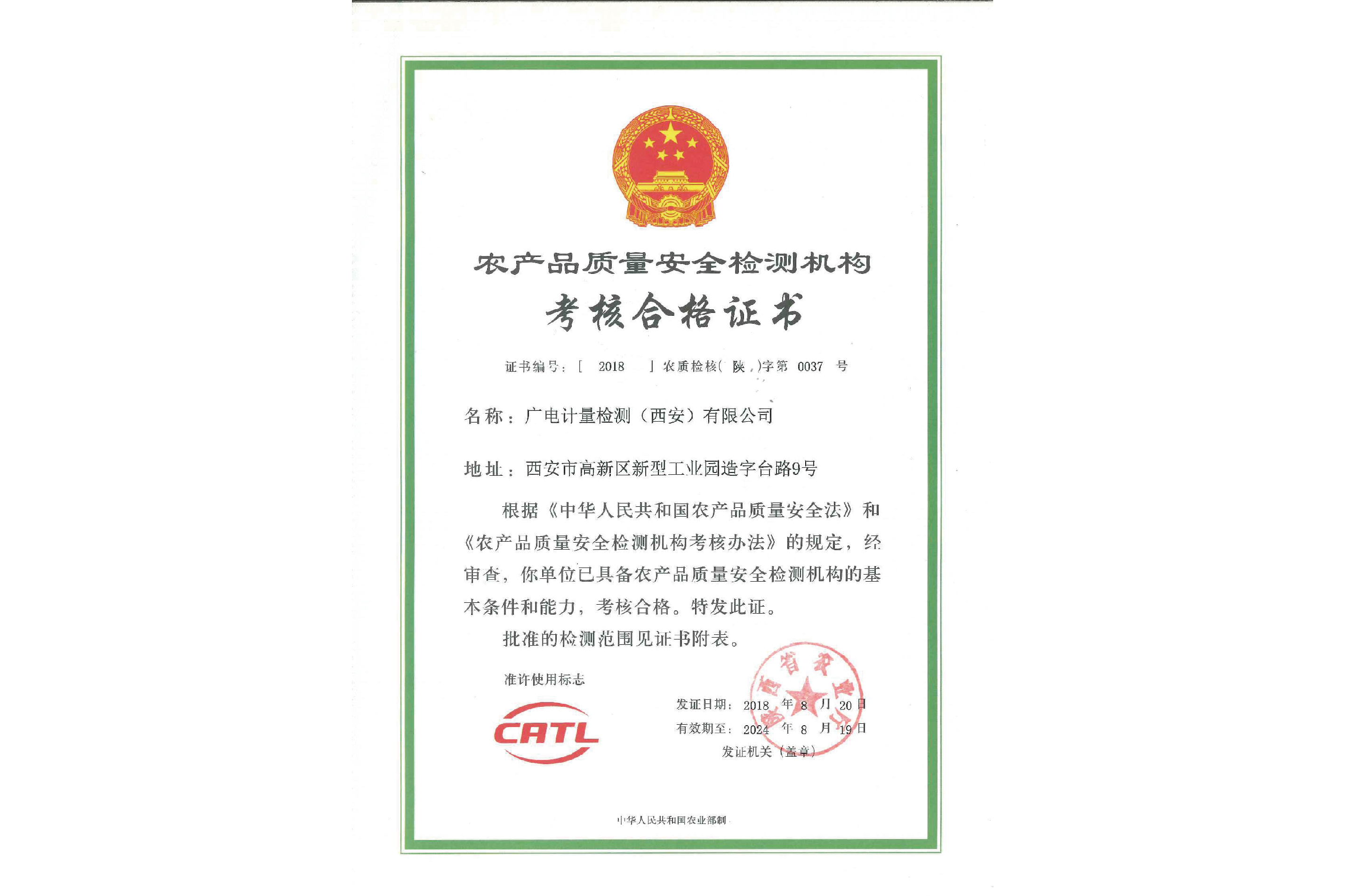 农产品质量安全检测机构(CATL)合格证书-开云(西安)有限公司