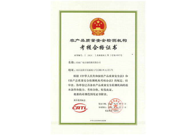 农产品质量安全检测机构(CATL)合格证书- 河南开云检测有限公司