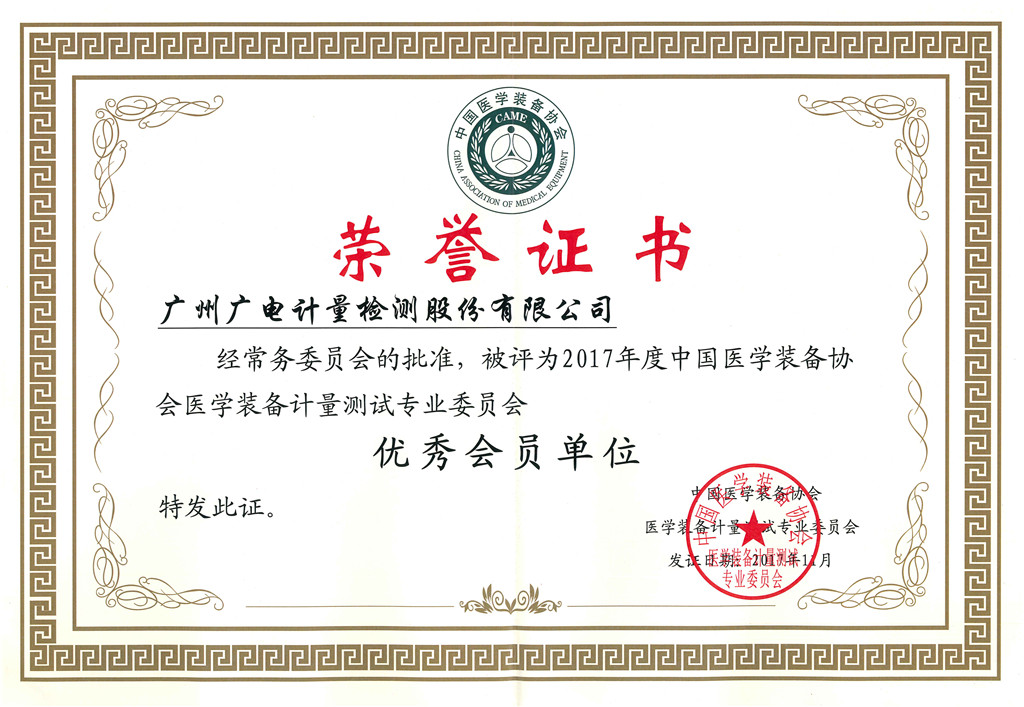 2017年度中国医学装备协会医学装备计量测试专业委员会优秀会员单位