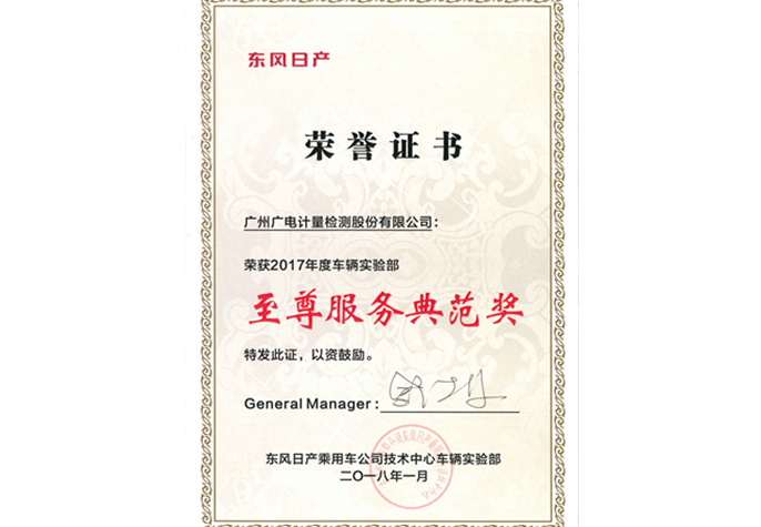 东风日产2017年度车辆实验部至尊服务典范奖