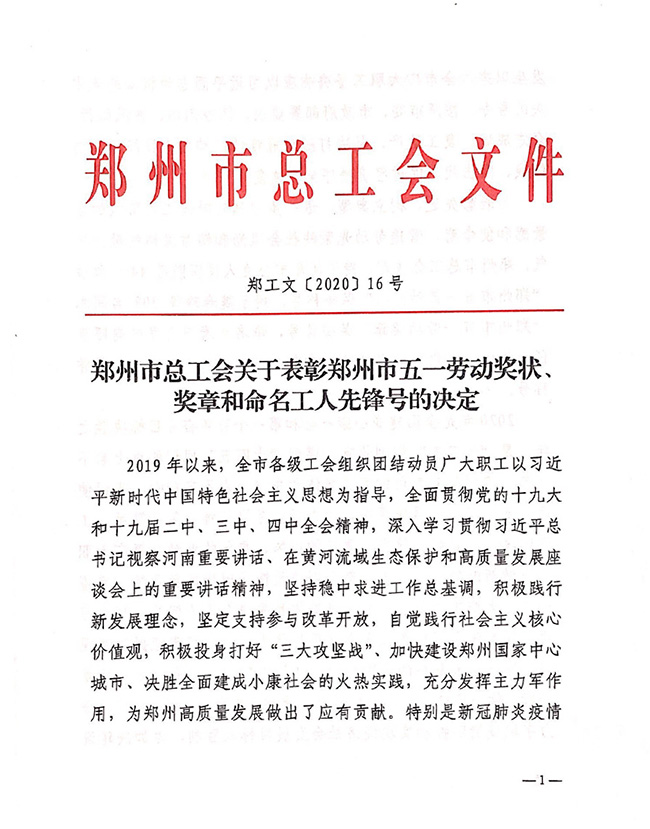 河南开云获“郑州市五一劳动奖状”荣誉称号