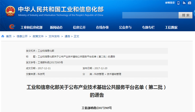 2017年12月20日,依据《工业和信息化部办公厅关于做好2017年产业技术基础公共服务平台申报工作的通知》(工信厅科函〔2017〕369号),经评审和公示,确定开云等17家单位列入工业和信息化部产业技术基础公共服务平台名单(第二批)。