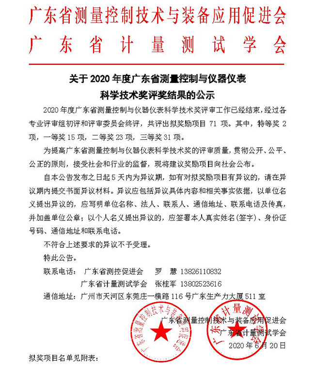资讯中心公司新闻喜讯!开云四项目获得2020年广东省测量控制与仪器仪表科学技术奖