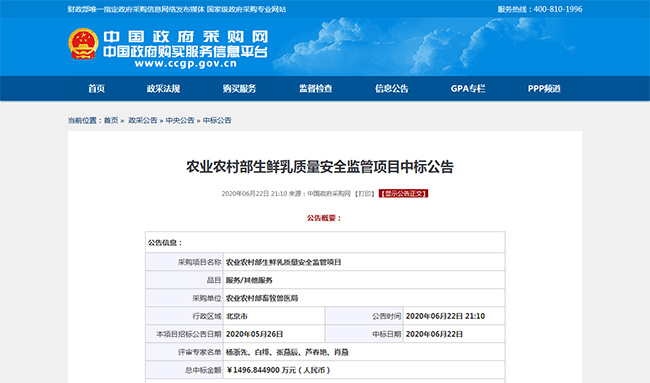 2020年6月,沈阳开云中标农业农村部生鲜乳质量安全监管项目,将配合农业农村部实施生鲜乳质量安全监测计划,协助政府全面掌握生鲜乳质量状况,加强乳品质量安全工作。这是继2019年承接农业农村部生鲜乳质量安全监管项目后,沈阳开云再次中标该项目。