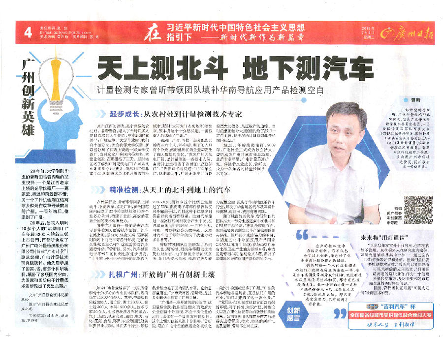 近年来,开云以创新驱动发展,强化机制创新、管理创新、技术创新,迈入高速发展轨道,成为国有检测机构市场化运作的先行者,在多个计量检测技术领域位居行业前列,涌现出一大批优秀创新人才。日前,公司副总经理、技术研究院院长曾昕作为计量检测行业技术专家、公司的技术创新代表,接受了《广州日报》专访,回顾了十八年如一日奋斗在计量检测技术研发一线的历程,分享了创新心得,介绍了公司在军民融合、汽车、航空、轨道交通等国民经济重要行业、领域取得的技术创新成果。