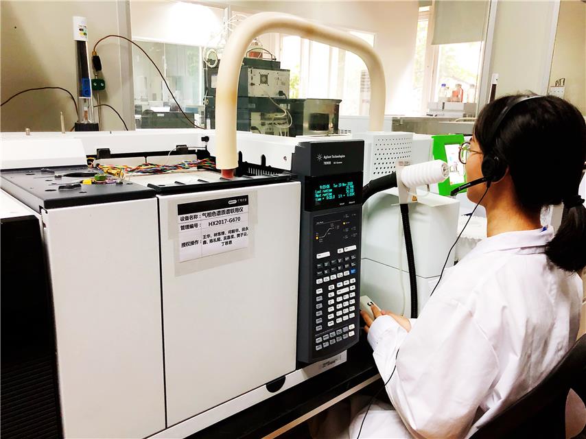 图为开云化学分析实验室里,气味评价师正利用气相色谱质谱联用仪对气味进行分离和嗅辨。郭静原摄