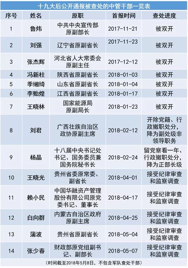中央纪委“深夜打虎”节奏不停。昨晚21时,中央纪委国家监委网站发布消息,财政部原党组副书记、副部长张少春涉嫌严重违纪违法,目前正接受中央纪委国家监委纪律审查和监察调查。张少春成为十九大后中央对外公开通报落马的第14名中管干部(详细名单见文后表格)。